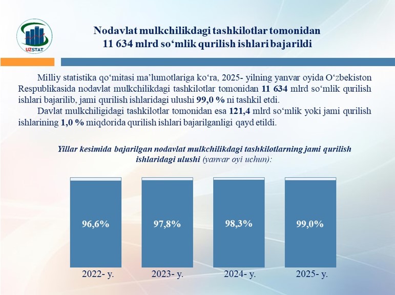 Milliy statistika qo‘mitasi ma’lumotlariga ko‘ra, O‘zbekistonda 2025-yil yanvar-iyul oylarida 1,9 mln tonna quyish uchun tayyor beton ishlab chiqarilgan.