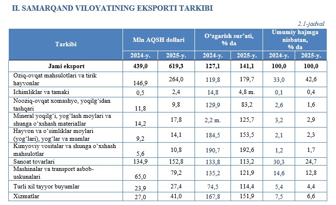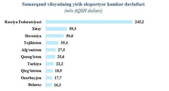 Samarqand viloyatining tashqi savdo aylanmasida eksport hajmi 619,3 mln AQSH dollariga (2024 yilning yanvar-iyul oyiga nisbatan 41,1 % ga ko‘paydi) va