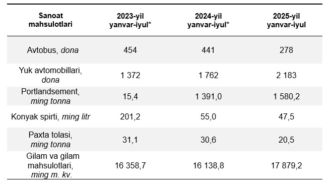 2025-yilning yanvar-iyul oylarida Samarqand viloyati bo‘yicha 17 879,2 ming metr kvadrat gilam va gilam mahsulotlari (10,8 % ga ko‘paygan) ishlab chiqarilgan.
