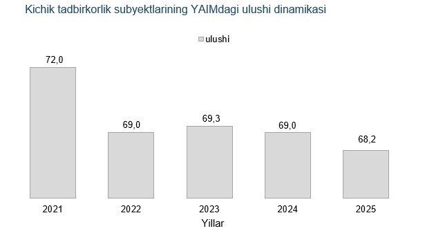 2025-yilning yanvar-iyunida YAHM tarkibida kichik tadbirkorlik subyektlarining ulushi 68,2 % ni tashkil qilib, 2024-yilning tegishli davriga nisbatan 0,8 % ga kamaygan.