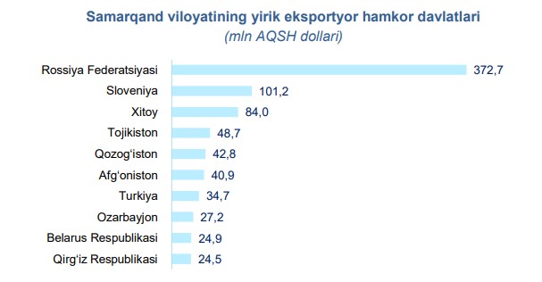 2025-yil yanvar-oktabr oylarida tashqi savdo aylanmasida tovarlar va xizmatlar eksporti bo‘yicha asosiy hamkorlarimiz Rossiya (39,3 %), Sloveniya (10,7 %),