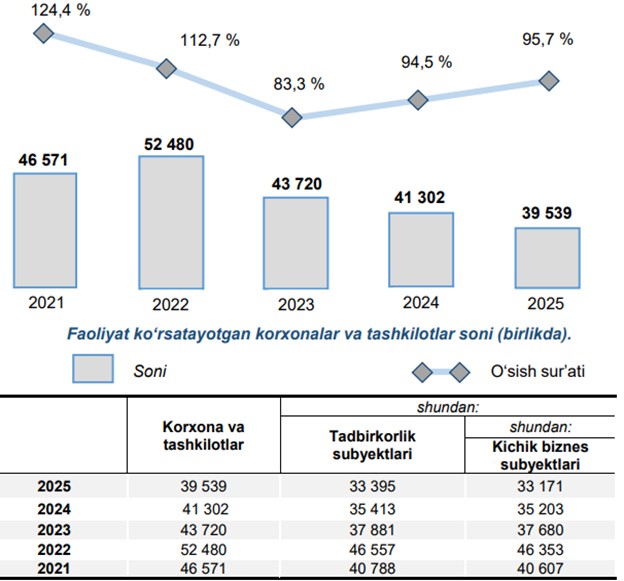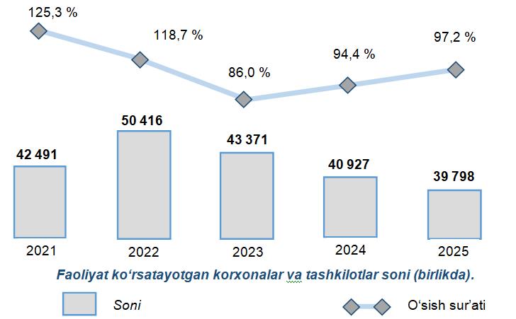 2025-yil 1-oktabr holatiga ko‘ra, 33 395 ta faol tijorat korxonalaridan 23 068 tasini mas’uliyati cheklangan jamiyatlar tashkil etgan bo‘lib, ular tashkiliy-