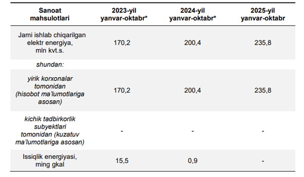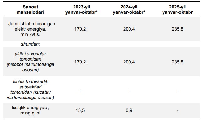 2025-yilning yanvar-oktabr oylarida o‘tgan yilning mos davriga nisbatan elektr