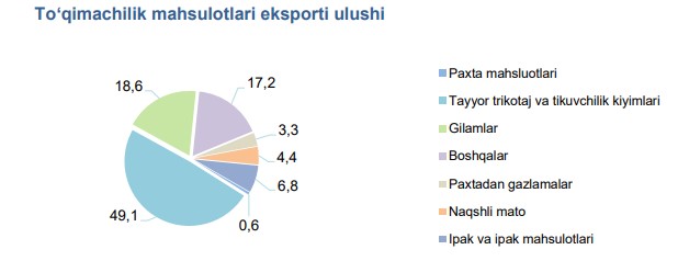 2025-yil yanvar-oktabr oylari yakuni bo‘yicha 59,1 mln AQSH dollarilik to‘qimachilik mahsulotlari eksporti amalga oshirilib, umumiy eksportning 6,2 % ini