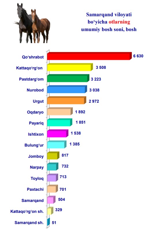 Samarqand viloyatida 2024-yilning 1-yanvar holatiga ko‘ra, otlarning umumiy bosh soni 29 884 taga yetdi. 2023-yilning mos davri bilan solishtirilganda, barcha toifadagi xo‘jaliklarda otlar bosh soni 1 147 taga (4,0 %) ko‘paydi.