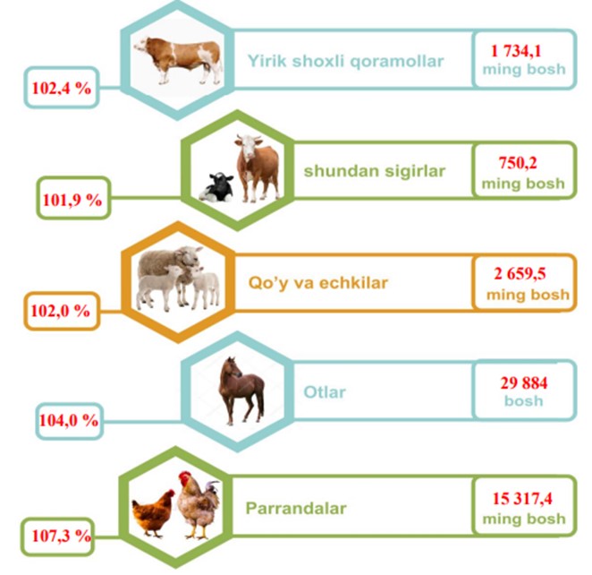 2024-yilning 1-yanvar holatiga ko‘ra, yirik shoxli qoramollarning umumiy bosh soni 1 734,1 mingtaga yetdi. 2023-yilning mos davri bilan solishtirilganda, barcha toifadagi xo‘jaliklarda yirik shoxli qoramollar bosh soni 40,5 mingtaga (2,4 %) ko‘paydi.