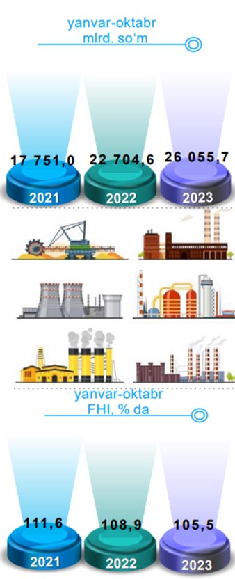 Dastlabki ma’lumotlaga ko‘ra, 2023-yilning yanvar-oktabr oylarida viloyat korxonalari tomonidan 26 055,7 mlrd. so‘mlik sanoat mahsulotlari ishlab chiqarilgan bo‘lib