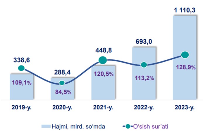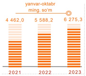 2019-yilning yanvar-sentabr oylariga nisbatan 2023-yilning ushbu oylarida yashash va ovqatlanish bo‘yicha xizmatlarning hajmi 771,7 mlrd. so‘mga oshib, 1 110,3 mlrd. so‘mni tashkil etdi.