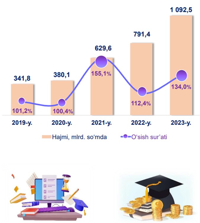 2023-yil yanvar-sentabr oylarida ta’lim sohasidagi xizmatlar hajmi 1 092,5 mlrd. so‘mga yetdi. O‘tgan yilning mos davriga nisbatan o‘sish sur’ati 134,0 % ni tashkil etdi.