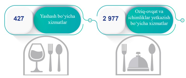 2023-yil 1-noyabr holatiga ko‘ra, yashash va ovqatlanish bo‘yicha xizmatlar sohasida faoliyat ko‘rsatayotgan korxonalar soni 3 404 tani tashkil etdi.