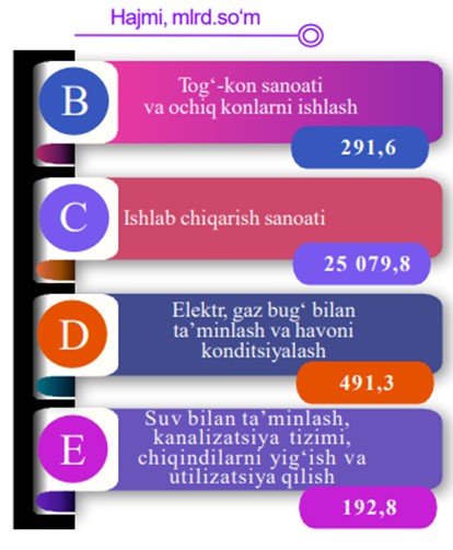 Sanoat ishlab chiqarishi tarkibida eng katta ulush ishlab chiqaradigan sanoat hissasiga to‘g‘ri kelib 25 079,8 mlrd. so‘mni, jami sanoat ishlab chiqarishidagi ulushi 96,3 % ni, tashkil etdi.