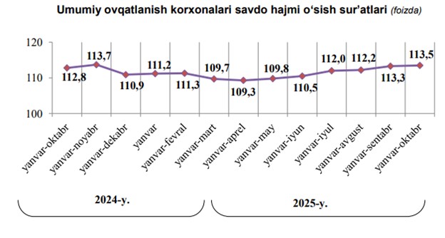Milliy statistika qo‘mitasi ma’lumotlariga ko‘ra, 2025-yilning 1-noyabr holatiga O‘zbekistonda umumiy ovqatlanish sohasida 25 887 ta tijorat korxonalari faoliyat yuritmoqda.