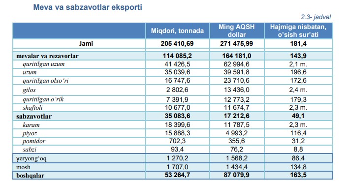 2025-yil yanvar-oktabr oylarida 205,4 ming tonna meva va sabzavotlar eksporti amalga oshirilgan bo‘lib, ushbu ko‘rsatgich 2024-yilning mos davriga nisbatan
