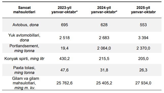 Milliy statistika qo‘mitasi ma’lumotlariga ko‘ra, 2025-yilning yanvar–oktabr oylarida O‘zbekistonda 865,8 trln so‘mlik sanoat mahsulotlari ishlab chiqarilgan.
