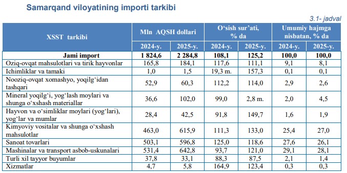 2025-yilning yanvar-oktabr oylarida import hajmi 2 284,8 mln AQSH dollariga yetdi va 2024-yilning mos davriga nisbatan 25,2 % ga ko‘paydi. Import tarkibida