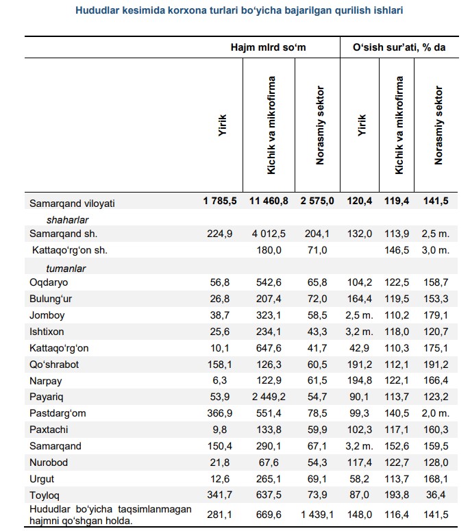 Samarqand viloyatida yirik qurilish tashkilotlari tomonidan bajarilgan qurilish ishlarining eng yuqori o‘sish sur’atlari Jomboy tumanida (2024-yilning mos davriga nisbatan 2,5 m.), Ishtixon