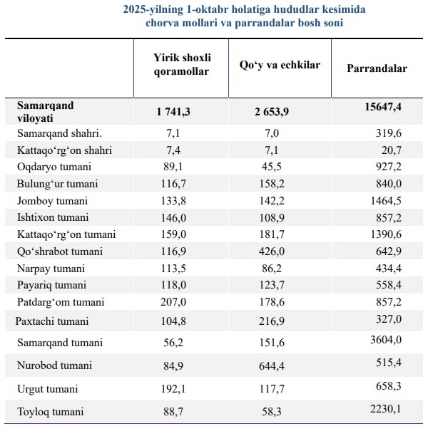 2025-yilning 1-oktabr holatigaSamarqand viloyatining barcha toifadagi xo‘jaliklarida yirik shoxli qoramollar bosh soni 1 741,3 ming boshga yetdi, (2024-