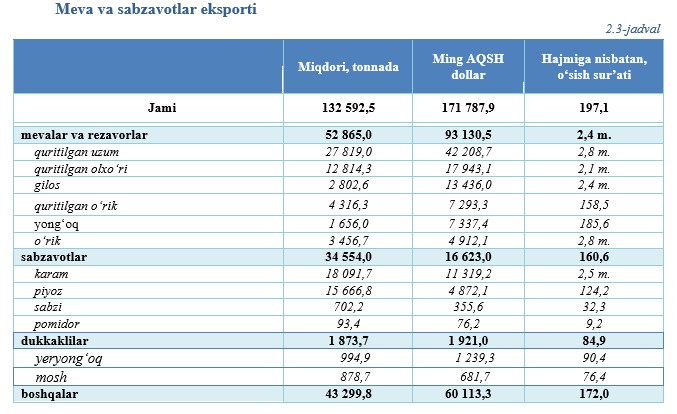 2025-yil yanvar-iyul oylarida 132,6 ming tonna meva va sabzavotlar eksporti amalga oshirildi.