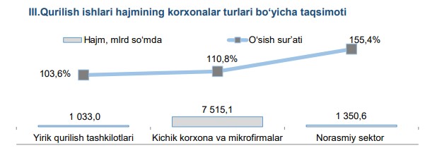 2025-yilning yanvar-iyul oylarida norasmiy sektorda qurilish ishlarining ulushi 13,6 % ni yoki 1 350,6 mlrd so‘mni tashkil etib, 2024-yilning mos davriga