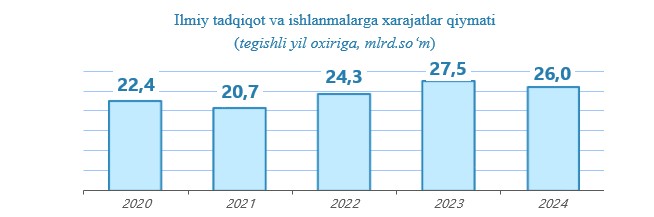 2024-yilda ilmiy tadqiqot va tajriba-konstruktorlik ishlanmalariga хarajatlarning eng ko‘p qismi Samarqand shahrida – 52,0 % (13,5 mlrd. so‘m),