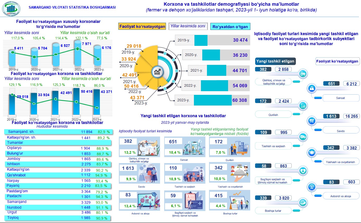 2023-yil 1-iyun holatiga qurilish sohasida ro‘yxatdan o‘tgan korxonalarning soni 51 277 ta bo‘lib, ularning o‘sish sur’ati 2022- yilning mos davriga nisbatan 108,1 foizni tashkil etdi.
