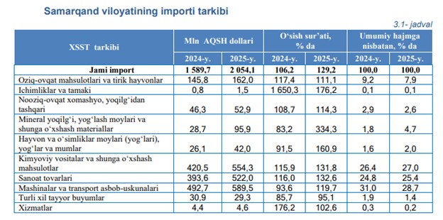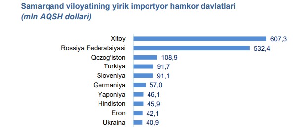 2025-yil yanvar-sentabr oylarida Samarqand viloyati 96 ta davlatdan tovar va xizmatlar importini amalga oshirdi. Yirik hamkor davlatlar XXR (29,6 %),