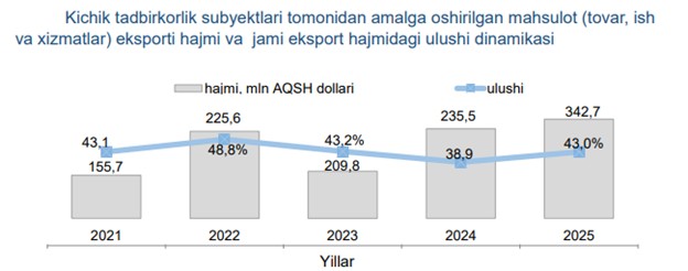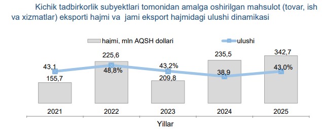 2025-yilning yanvar-sentabrida kichik tadbirkorlik subyektlari tomonidan amalga oshirilgan mahsulot (ishlar va xizmatlar) eksporti hajmi 342,7 mln AQSH