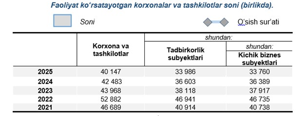 Milliy statistika qo‘mitasi ma’lumotlariga ko‘ra, 2025-yilning 1-noyabr holatiga O‘zbekistonda 465,9 mingta korxona va tashkilotlar faoliyat yuritmoqda.