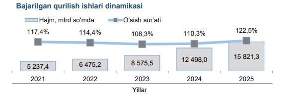 2025-yilning yanvar-oktabr oylarida, Samarqand viloyatida jami 15 821,3 mlrd so‘mlik qurilish ishlari bajarilib, 2024-yilning mos davriga nisbatan 122,5 % ni