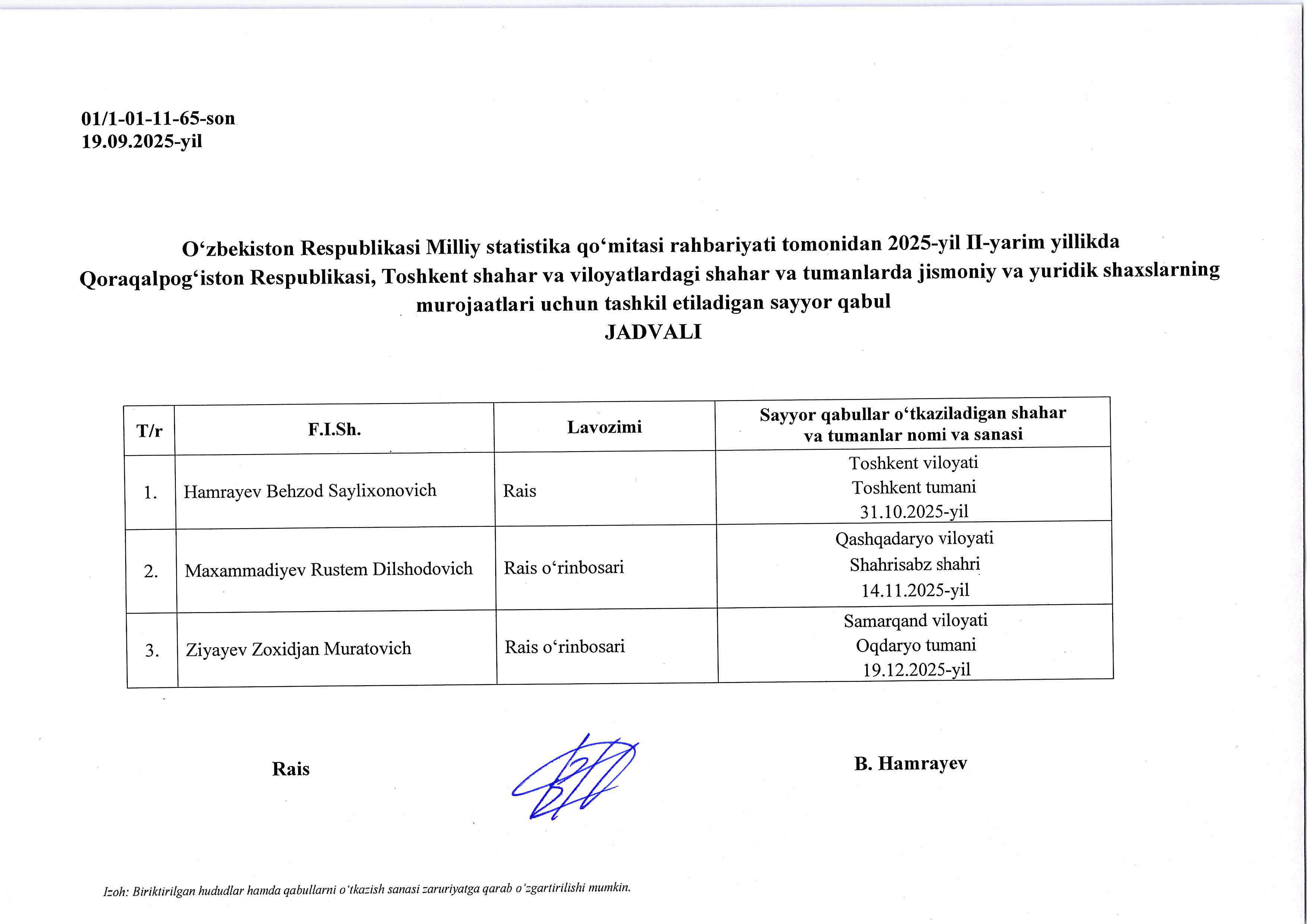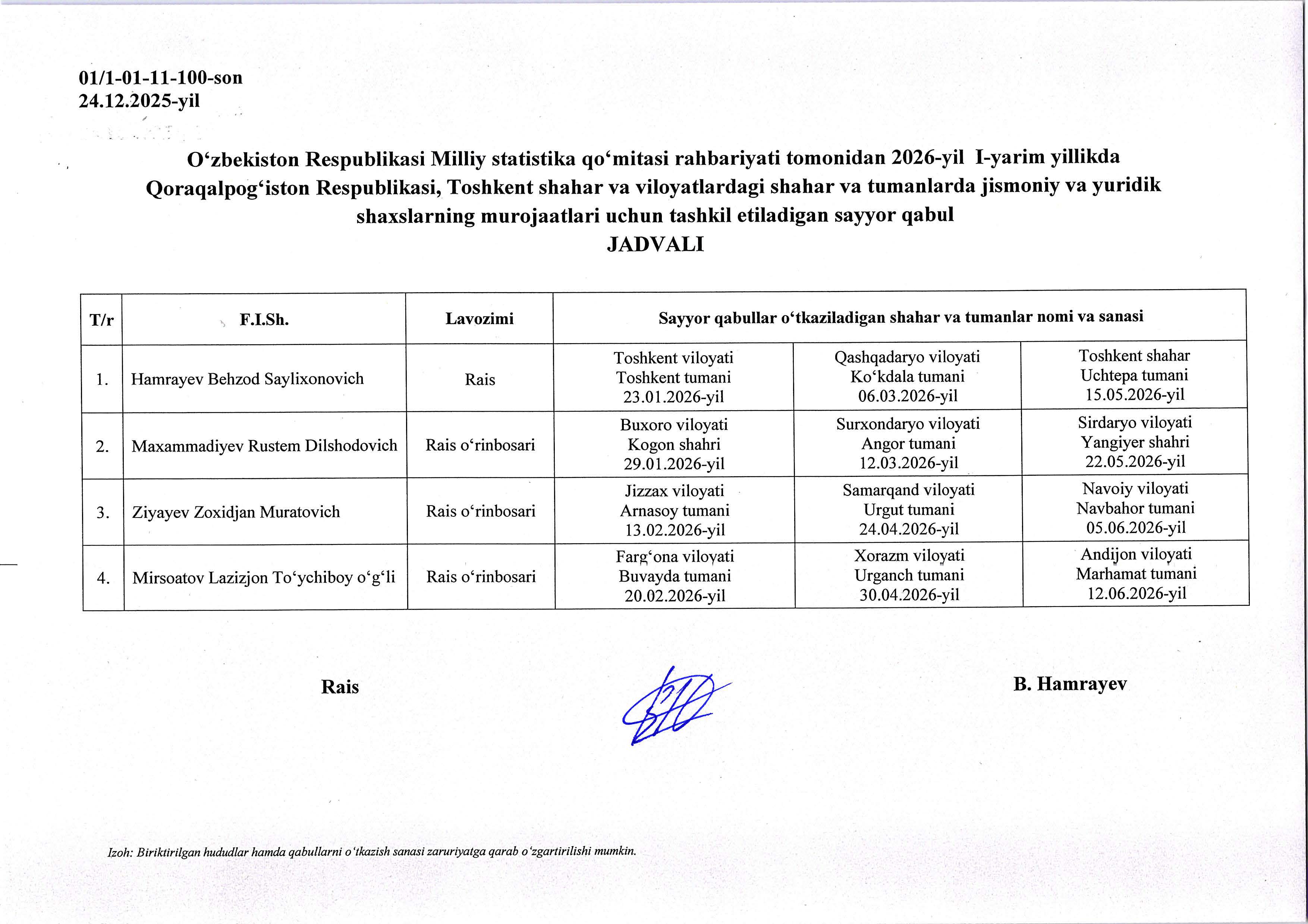 O‘zbekiston Respublikasi Milliy Statistika Qo'mitasi rahbarlarining 2025- yil II-yarim yillikda