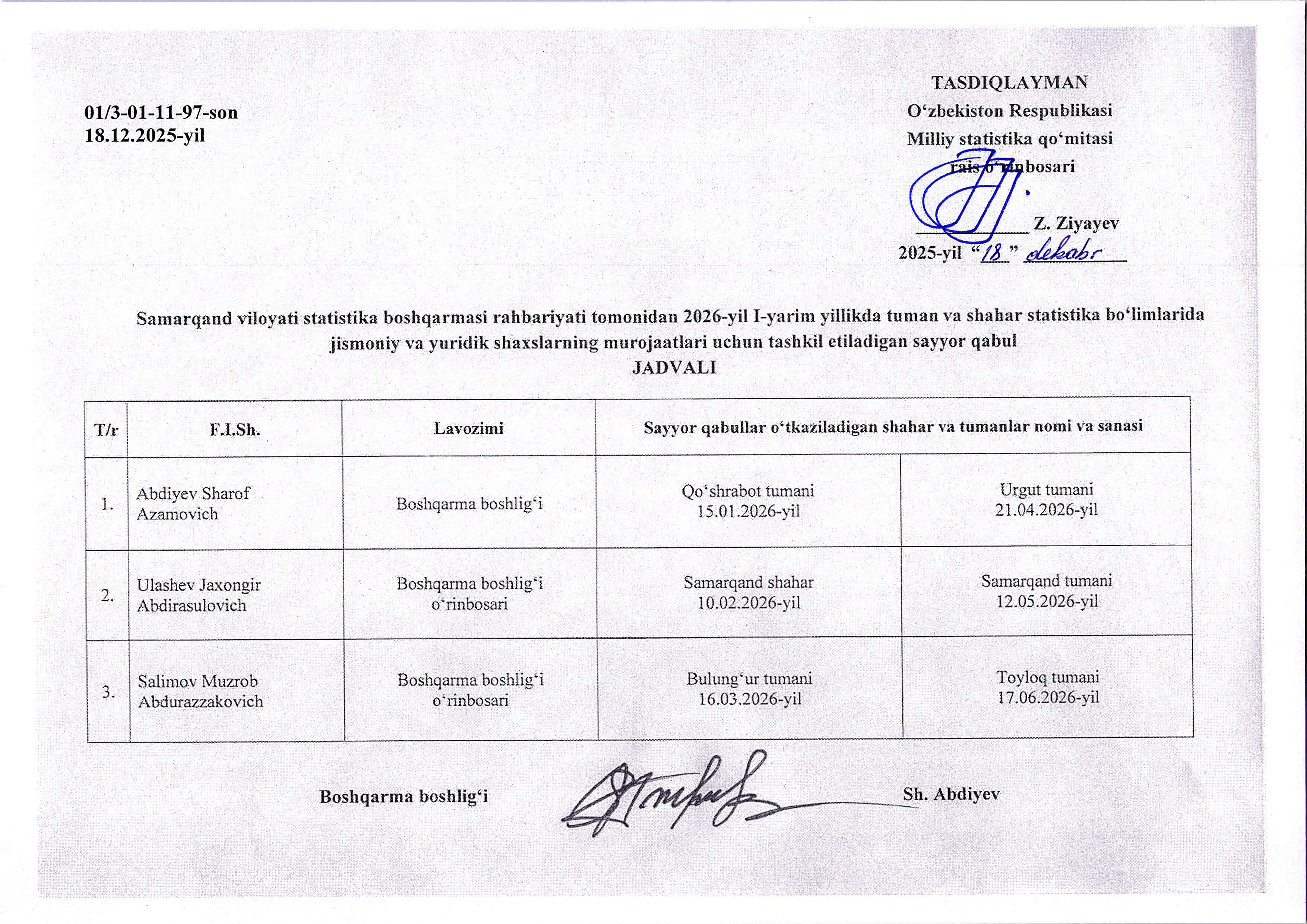 Samarqand viloyati statistika boshqarmasi rahbarlarining 2025- yil II-yarim yillikda